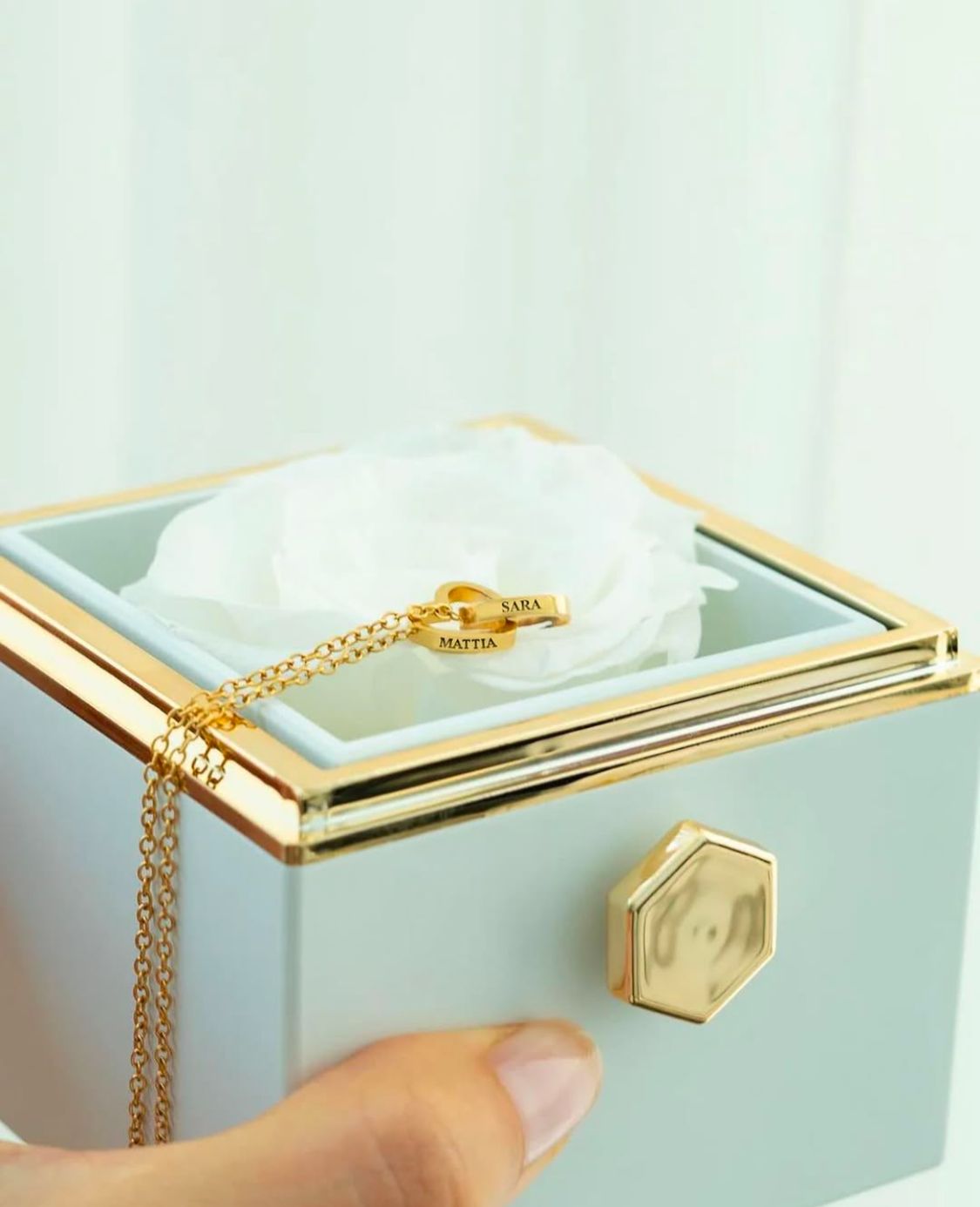 Our special package with a real rose preserved to retain its beauty for life, turns to reveal an 18-karat gold necklace personalized with engravings of your choice. It's a gift that will remain forever etched in the heart of your special someone. Imagine their reaction... ❤️